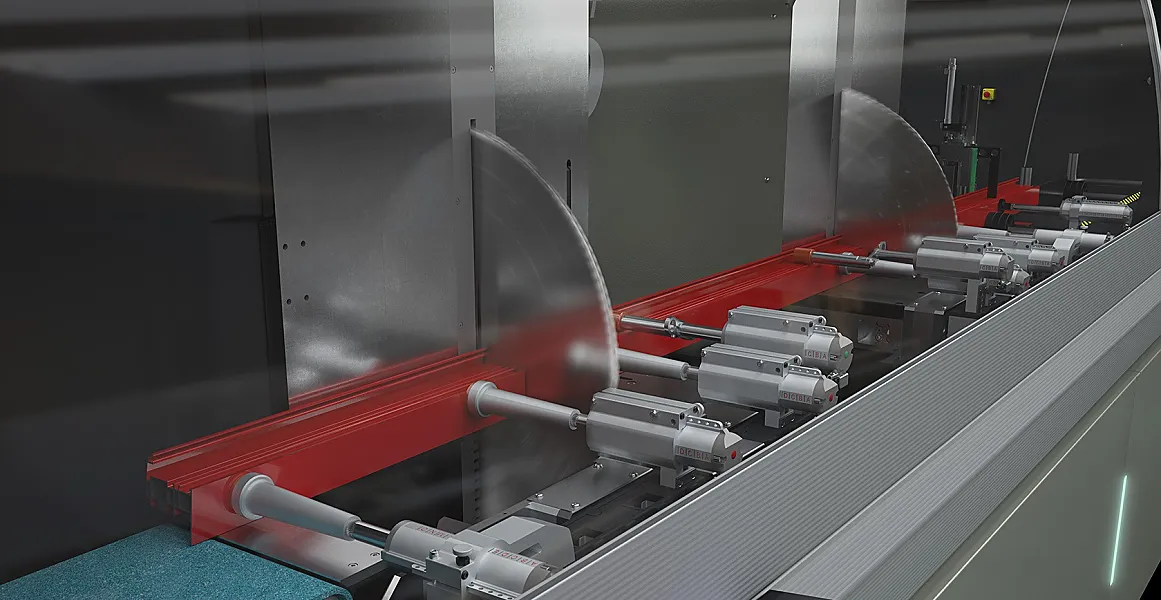 Doppelgehrungssäge Compound Cut mit 600 mm Sägeblättern und 9 gesteuerten Achsen. Die Lösung für grosse Profile und Gehrungen in 2 Achsen (Schifterschnitt).