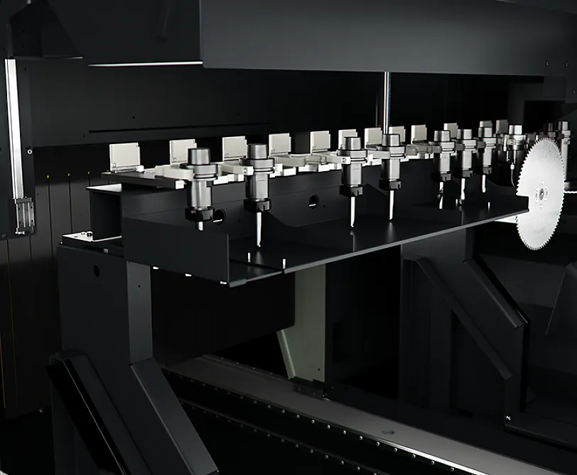 Das direkt auf dem Schlitten der Maschine montierte Werkzeugmagazin bietet ein grosses Fassungsvermögen und arbeitet schnell; eingeschwenkt in die Parkposition ist der maximale Schutz des Werkzeugaufnahmekegels gegen Späne und Schläge sichergestellt. Das Magazin verfügt über 12 Werkzeugpositionen - darunter eine für ein Sägeblatt mit einem Durchmesser von 300 mm - die vom Bediener nach eigenem Ermessen konfiguriert werden können. In jeder Position des Magazins erfasst ein Sensor die richtige Positionierung des Werkzeugaufnahmekegels und gewährleistet so einen effizienten und sicheren Werkzeugwechsel.