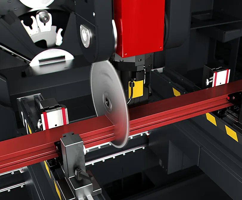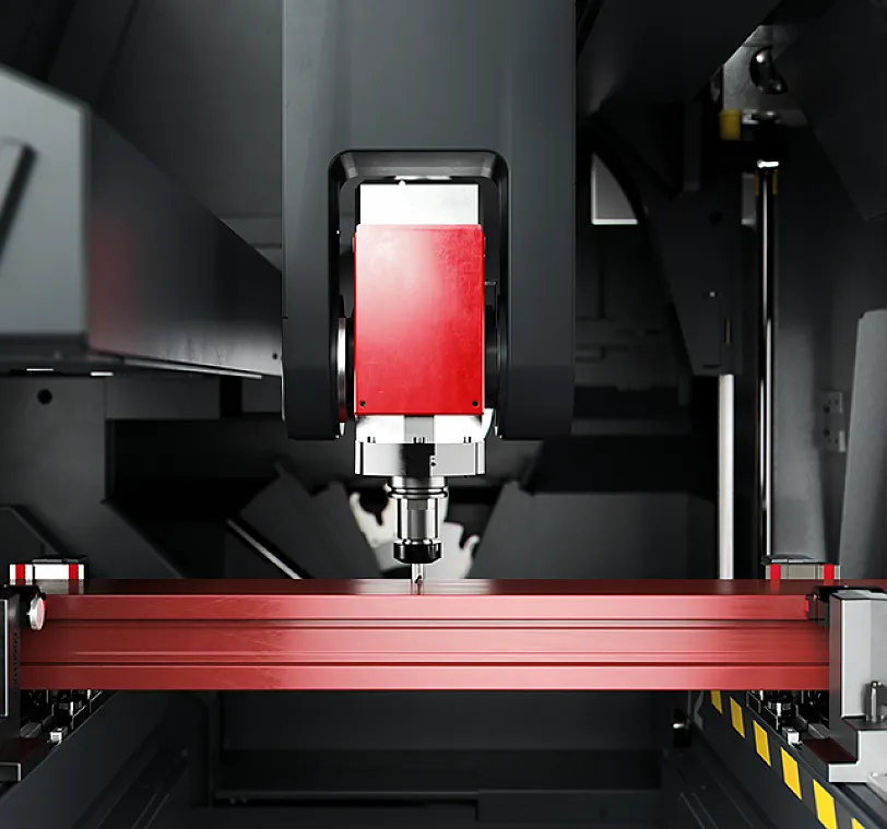 Die Frässpindel mit einer Leistung von 8,5 kW und die Werkzeugaufnahme HSK63F ermöglichen Bearbeitungen, auch schwerer, mit optimalen Resultaten in Sachen Geschwindigkeit und Präzision. Die Bewegung der Frässpindel entlang der A-Achse ermöglicht Drehungen von 0° auf 180°, sodass das Profil an 3 Seiten bearbeitet werden kann, ohne es neu positionieren zu müssen. Optional steht eine Frässpindel mit 11 kW und Encoder für das starre Gewindebohren zur Verfügung.