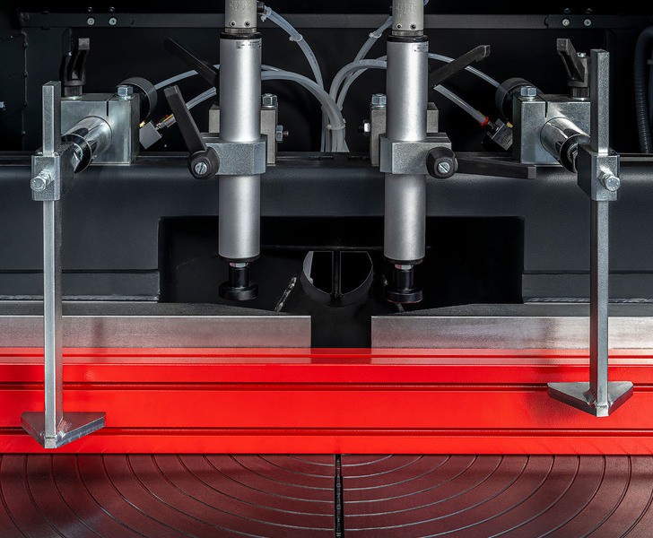 Dank der angewandten technischen Lösungen gewährleisten die horizontalen und vertikalen Spanneinrichtungen gleichzeitig extreme Stabilität beim Einspannen des Werkstücks und schnelles Umspannen. Aufgrund dieser Besonderheiten kann diese Maschine sowohl im Fenster- und Türenbau als auch zum Sägen von Industrieprofilen eingesetzt werden.