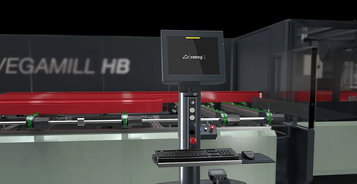 Durchlauf-Profilbearbeitungszentrum Vegamill HB mit 8–14 CNC-Achsen. Ermöglicht kombinierte Bearbeitungen wie Bohren, Fräsen und Schneiden an Profilen aus Aluminium und Leichtmetallen.