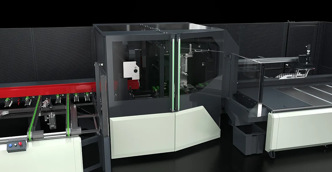 Das zweite besteht aus einem Entladetisch mit einer CNC-Entsorgungszange, welche das Entladen grösserer Stücke mit einer Länge bis 2500 mm ermöglicht. Das Entlademagazin sammelt die fertigen Werkstücke auf. Ein Belegungssensor meldet wenn das Magazin voll ist und unterbricht den Entsorgungsprozess.