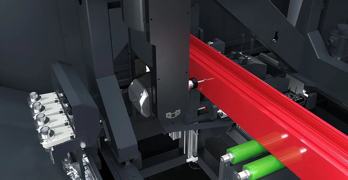 Optional kann die horizontale und vertikale Position der Pusherzange über CNC-Achsen angefahren werden. Das mit Riemen ausgestattete Lademagazin ermöglicht das Laden von Profilen mit einer Länge bis 7,5 m