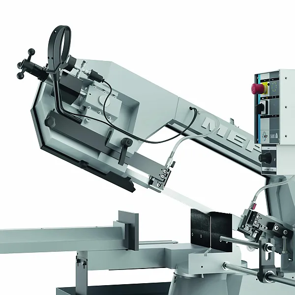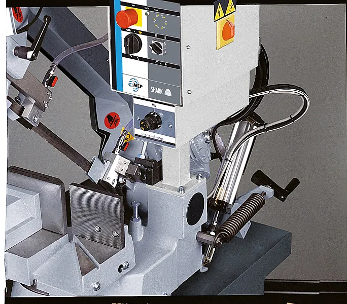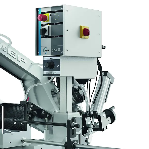Bandsägemaschine SHARK 281 CCS / MA mit automatischer Absenkung (Cut control System) für Schnitte von 0° bis 60° links.