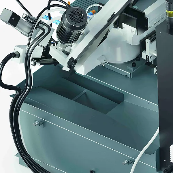 Kreissägeautomat mit vollautomatischer Gehrungsverstellung zwischen –45° bis +45°.
