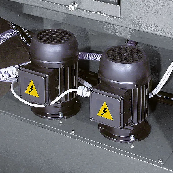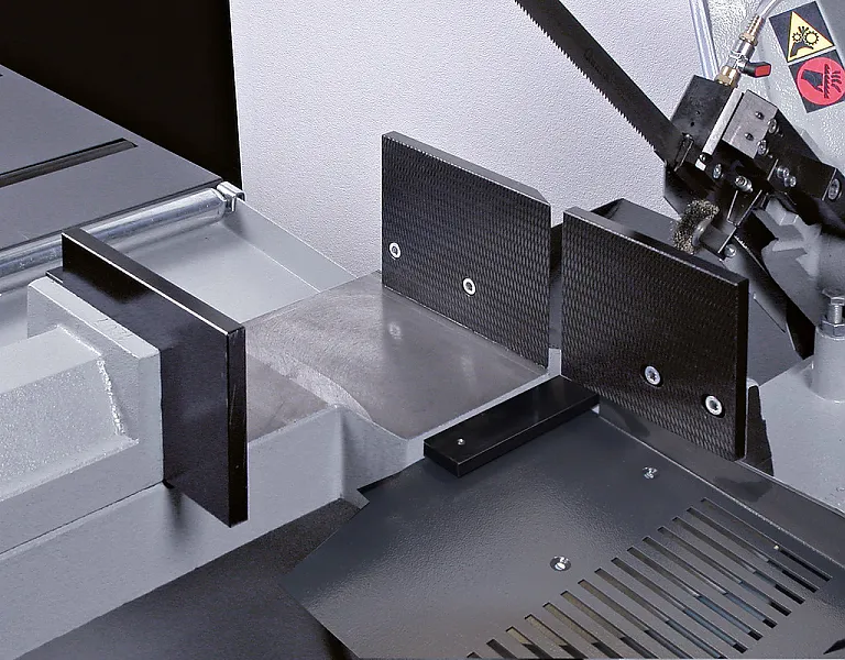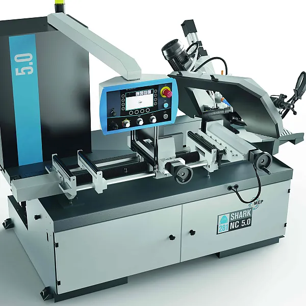 Elektrohydraulischer Bandsägevollautomat SHARK 281 NC 5.0 mit zusätzlich halbautomatischer, halbautomatisch-dynamischer und manueller Funktion, für Schnitte von 0° bis 60° links.