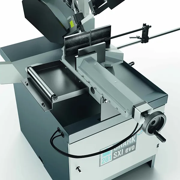Elektrohydraulische, halbautomatische Sägemaschine SHARK 281 SXI EVO für Gehrungsschnitte von 0° bis 60° links.