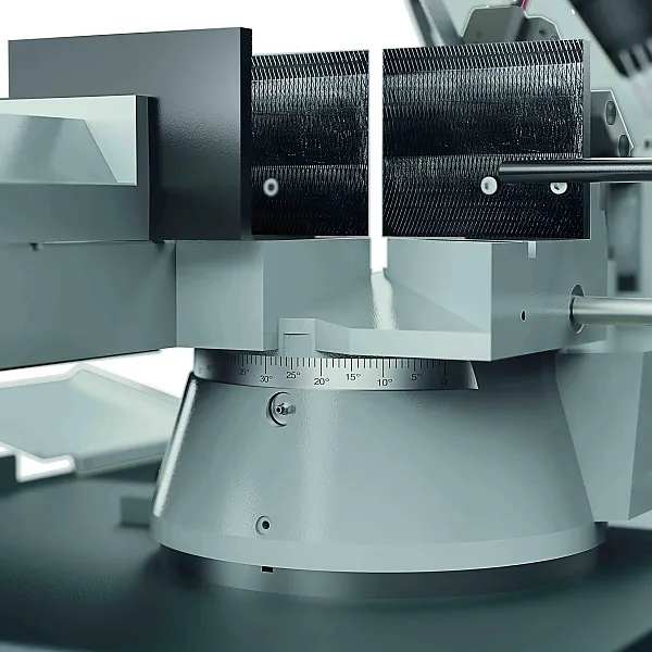 Das Ganze ist so ausgelegt, dass Späne und Kühlmittel auch bei maximaler Gehrung vollständig zurückgewonnen werden.