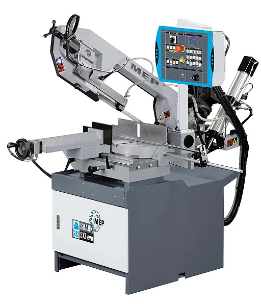 Hydraulische Bandsägemaschine (halbautomatisch) SHARK 282 SXI EVO mit zusätzlich manueller und halbautomatisch-dynamischer Funktion für Gehrungsschnitte von 45° rechts bis 60° links.