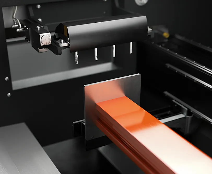Die Frässpindel mit 4 kW in S1 kann eine Drehzahl von 20.000 U/min erreichen. Die Bewegung der Frässpindel entlang der A-Achse ermöglicht Drehungen von -90° auf +90°, sodass das Profil an 3 Seiten bearbeitet werden kann, ohne es neu positionieren zu müssen. Geeignet für Profilstäbe aus Aluminium, PVC und Leichtmetallen sowie für Stahl-Strangpressprofile bis 2 mm.