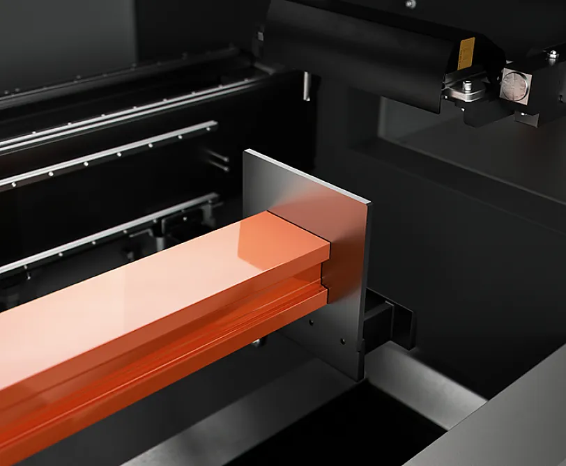 Die Maschine ist mit einem robusten Anschlag für die Stabreferenz ausgestattet, der sich auf der linken Seite befindet. Der, von einem pneumatischen Zylinder betätigte Anschlag ist versenkbar und wird von der Maschinen-Software automatisch entsprechend den durchzuführenden Bearbeitungsvorgängen gewählt.