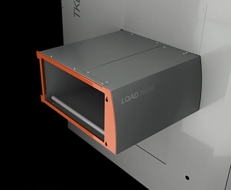 Das serienmässige, einziehbare Werkzeugmagazin nimmt 9 Werkzeugaufnahmekegel auf, die manuell entnommen und an der Spindel angebracht werden können. Die Positionsnummerierung ermöglicht die Identifizierung des vom HMI für jeden Bearbeitungsvorgang benötigten Werkzeugs. Das Magazin befindet sich an der Maschine in einer Position, die eine bequeme Handhabung durch den Bediener ermöglicht.