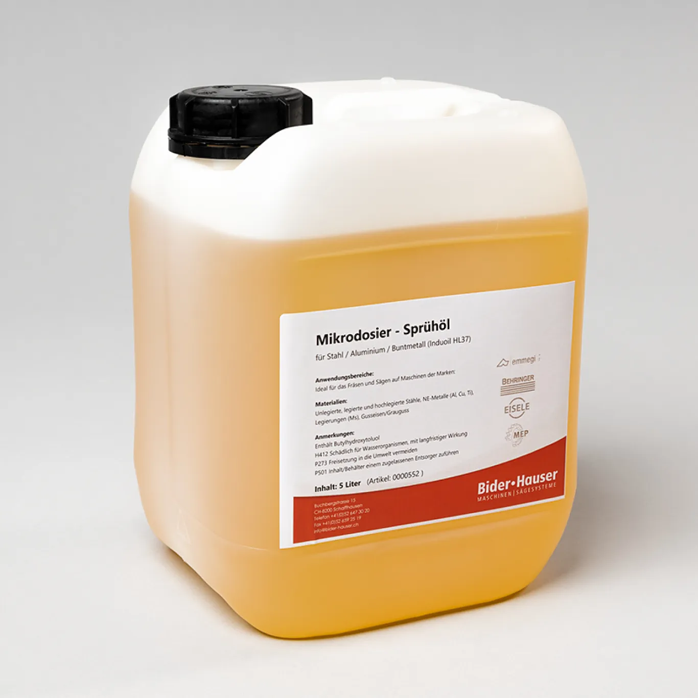 Das Bider Hauser Microdosier Sprühöl ist ein Hochleistungsöl auf Basis lebensmittelechter Pflanzenöle, versehen mit einer wirksamen Additiv-Kombination und guter Netz- und Schmierwirkung. Ideal zur Anwendung bei der spangebenden Bearbeitung wie Fräsen und Sägen.